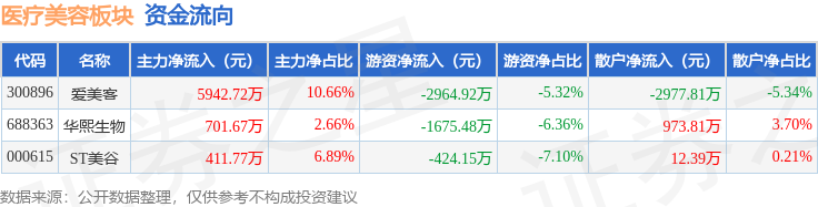 从资金流向上来看,当日医疗美容板块主力资金净流入7056.16万元,游资资金净流出5064.55万元,散户资金净流出1991.61万元。医疗美容板块个股资金流向见下表: